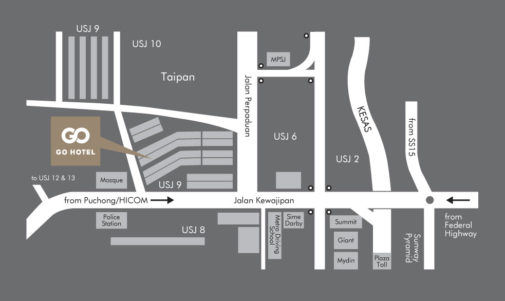 Go Hotel is strategically located within the vibrant Taipan Business Centre enclave and is a stone's throw from Subang's many industrial and commercial parks. We are a convenient access to nearby colleges, malls and theme parks such as Taylor's, INTI, Summit, Main Place and Sunway Lagoon.